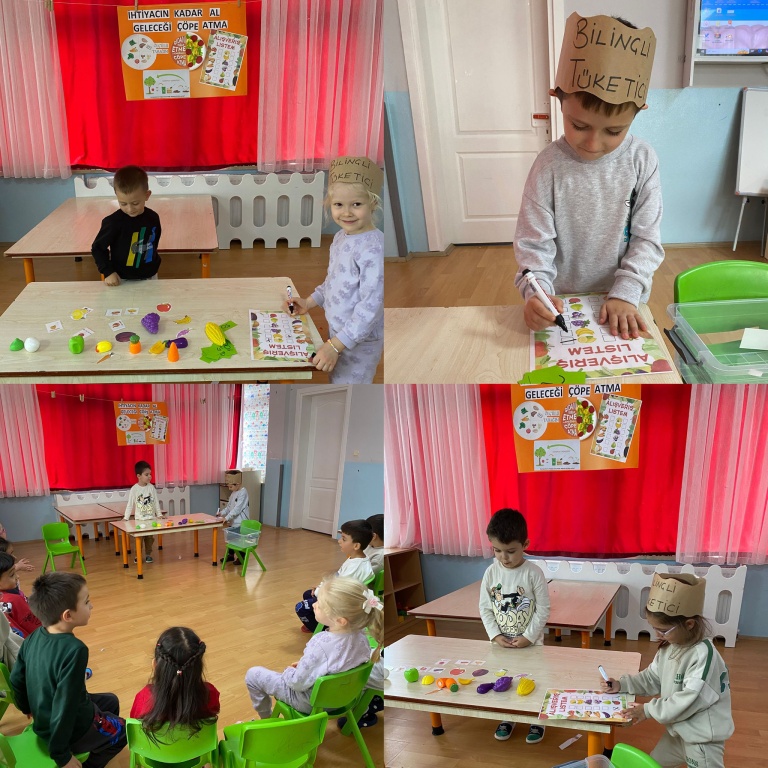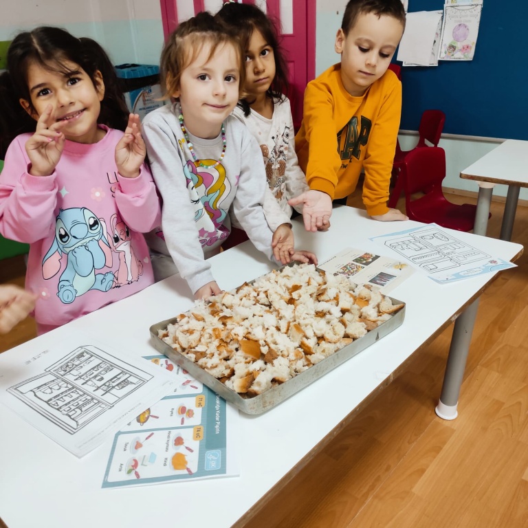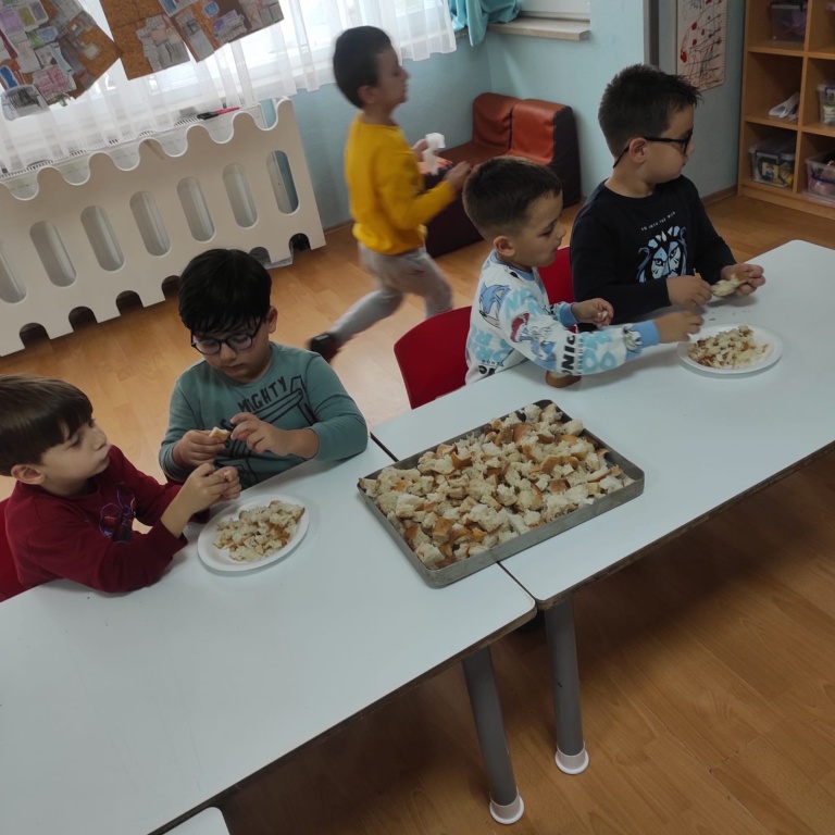 Sağlıklı Beslenme Yolculuğum Projesi kapsamında Gıda israfı tanımlamasını yapıp önleyici tedbirler hakkında bilgilendirme videosu izledik, okulumuz mutfağında saklama örneklerini inceledik, yiyebileceğimiz kadar yemek almayı ölçülü tabak etkinliğimiz ile öğrendik. Kompost yapımını inceledik ve planlı alışveriş yapmayı drama etkinliğimiz ile pekiştirdik.Bayat ekmekleri küçük küçük kopartıp fırında kızarttık.Çorbalarımıza katmak üzere hazırladık.Bayat ekmekleri atma, gıda israfına dur de !